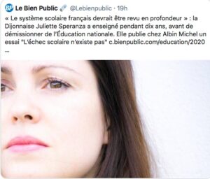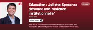 Invitée de RTL – Juliette Speranza, ancienne enseignante, explique son choix d’avoir quitté l’éducation et présente son livre » l’échec scolaire n’existe pas » aux éditions Albin Michel.